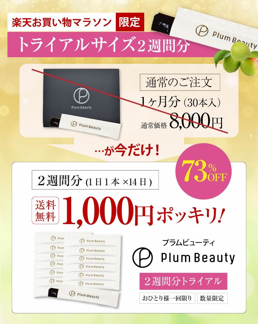他の画像を見る \初回限定価格73%OFF/梅肉エキスと植物発酵エキスの力ですっきりを実感!おひとり様1セット限定 <2週間トライアルサイズ>PlumBeauty(プラムビューティー)2週間分14本入り 当店特別価格 ¥ 1,000 税込 商品詳細を見る お気に入りに登録する