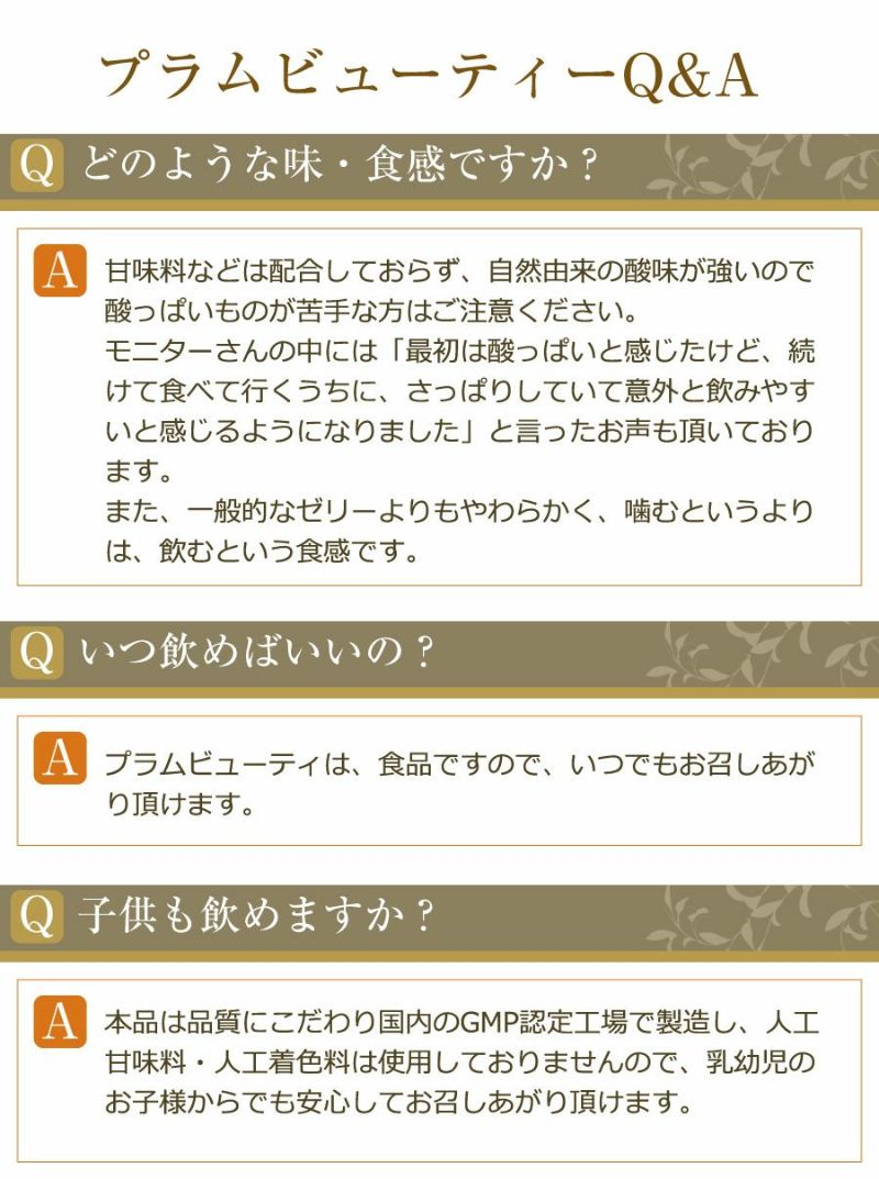 梅エキス、果糖、果汁(梅、りんご、プルーン、オレンジ、ブドウ)、植物発酵物、加工黒糖、デキストリン、ヨモギ抽出物、こんにゃく粉、黒コショウ抽出物/クエンシクロデキストリン、甘味料(ステビア)、クエン酸、葉酸(原材料の1部にバナナ、大豆、もやし、黒豆、ゴマ、カシューナッツ含む)