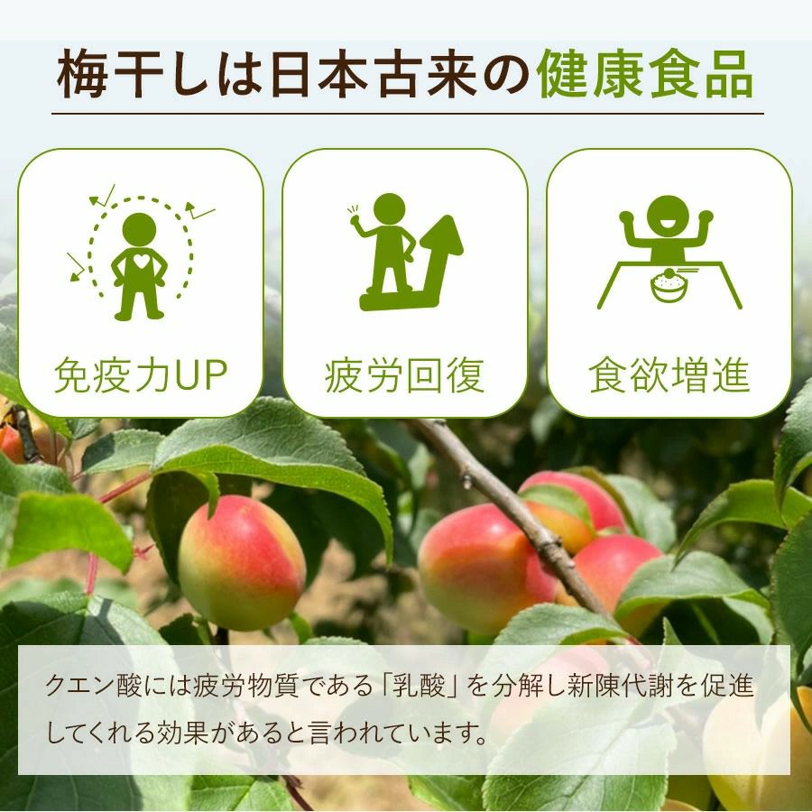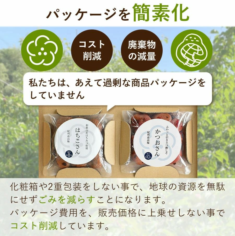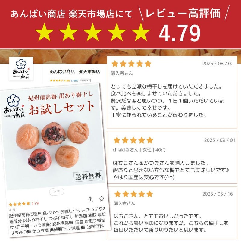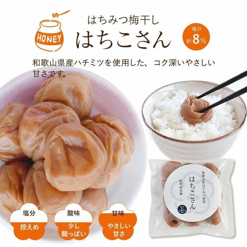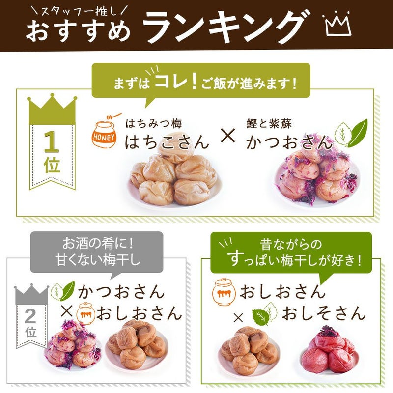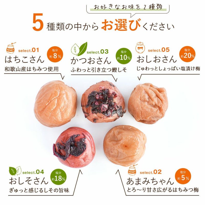 はちみつ梅(はちこさん) 8%、 かつお梅(かつおさん)10%、白干梅(おしおさん) 20%、しそ漬梅(おしそさん)20%、はちみつ梅(あまみちゃん) 5%