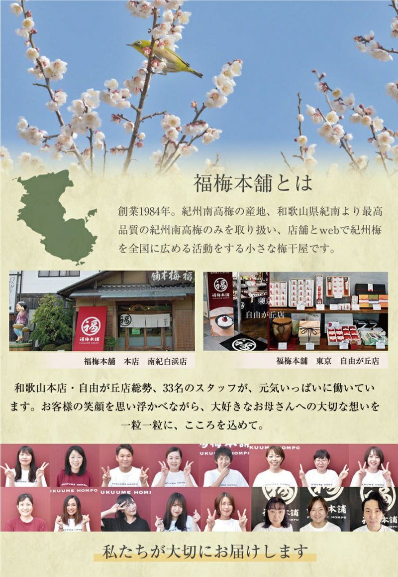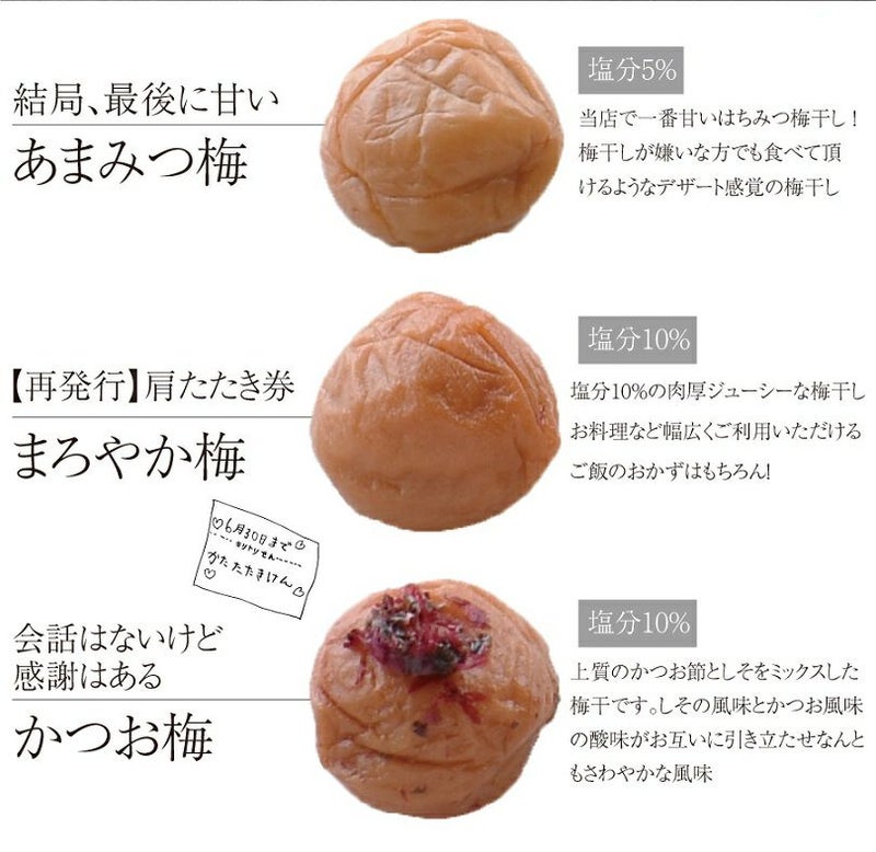 かつお梅:梅、しそ、かつお削り節、漬け原材料〔食塩、還元水飴、発酵調味料、糖類(砂糖・果糖ぶどう糖液糖)、たん白加水分解物、はちみつ〕、調味料(アミノ酸等)、酸味料、ビタミンB1、甘味料(ステビア)、野菜色素、(原材料の一部に大豆を含む)