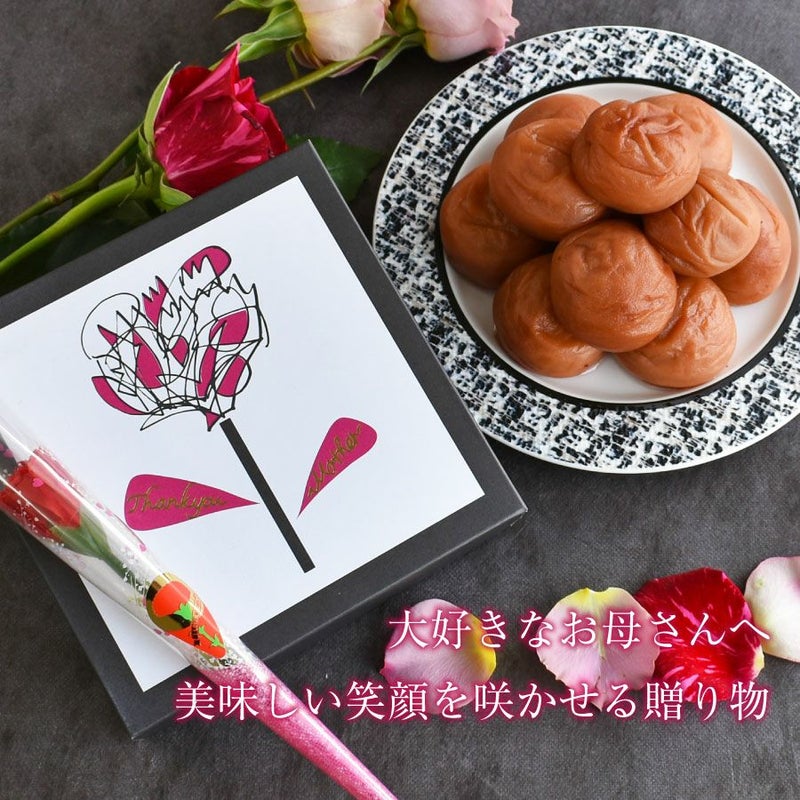 カーネーションのラッピングが華やかですごく良かったです。梅干しは5%の方が食べやすかった様です。年配の方にはもう少し小さい梅の方が食べやすいと思いました。最近は母も健康志向なので、とても喜んでくれました。