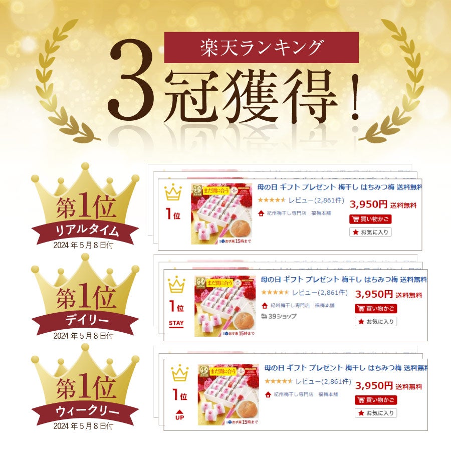 他の画像を見る 手にした瞬間伝わる「ありがとう」の気持ち 母の日限定ギフト 紀州ハチミツ梅【Thanks BOX】400g 当店特別価格 ¥ 3,500 税込 会員価格あり 販売期間 2026/03/01 10:00 〜 2026/05/18 9:59 商品詳細を見る お気に入りに登録する