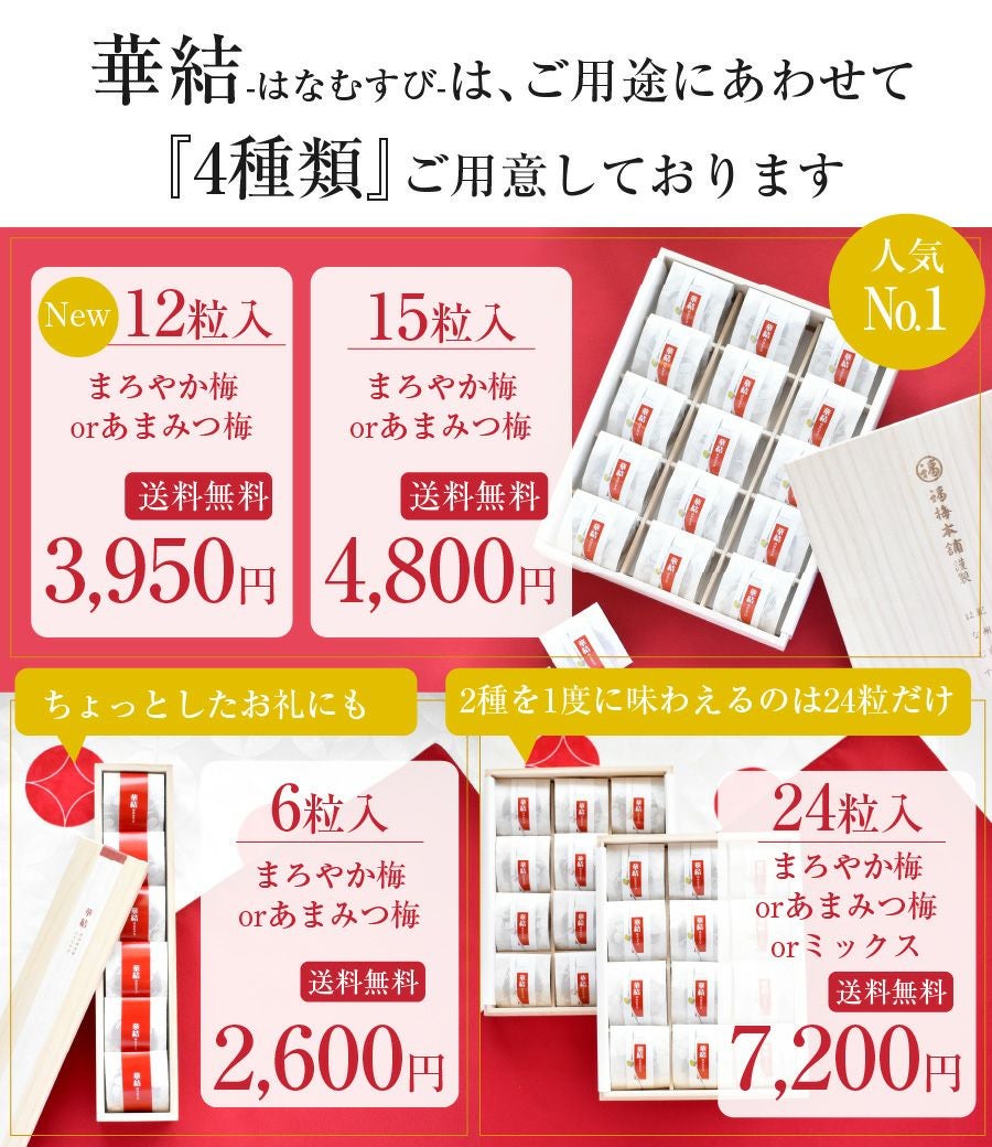 他の画像を見る 母の日\超早割500円OFF/3/12(木)09:59まで※会員割引対象外 最高級紀州はちみつ梅2種入り母の日限定「華結(はなむすび) 8粒入 Hanataba-はなたば-」 送料無料 プレゼント 限定販売 定価 ¥ 2,950 のところ 当店特別価格 ¥ 2,450 税込 販売期間 2026/03/01 10:00 〜 2026/05/18 9:59 商品詳細を見る お気に入りに登録する