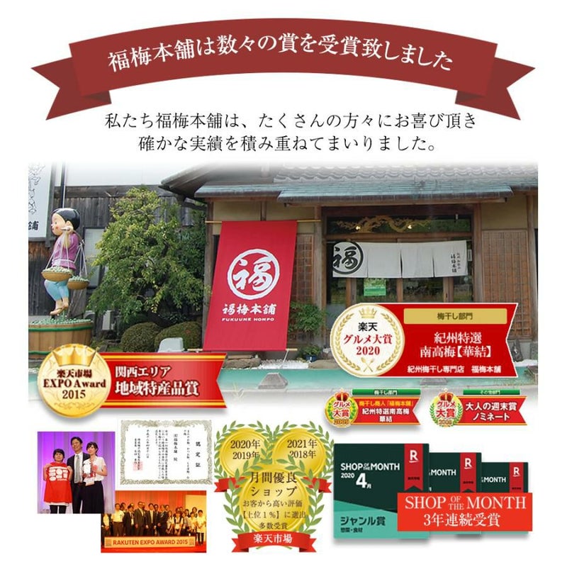 創業1984年。紀州南高梅の産地、和歌山県紀南より最高 品質の紀州南高梅のみを取り扱い、店舗とwebで紀州梅 を全国に広める活動をする小さな梅干屋です。