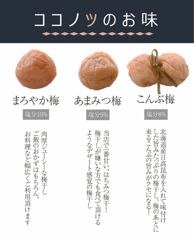 こんぶ梅:梅、昆布、漬け原材料[食塩、還元水飴、醸造酢、昆布エキス、酵母エキス、魚醤]、酸味料、酒精、ビタミンB1、甘味料(ステビア)