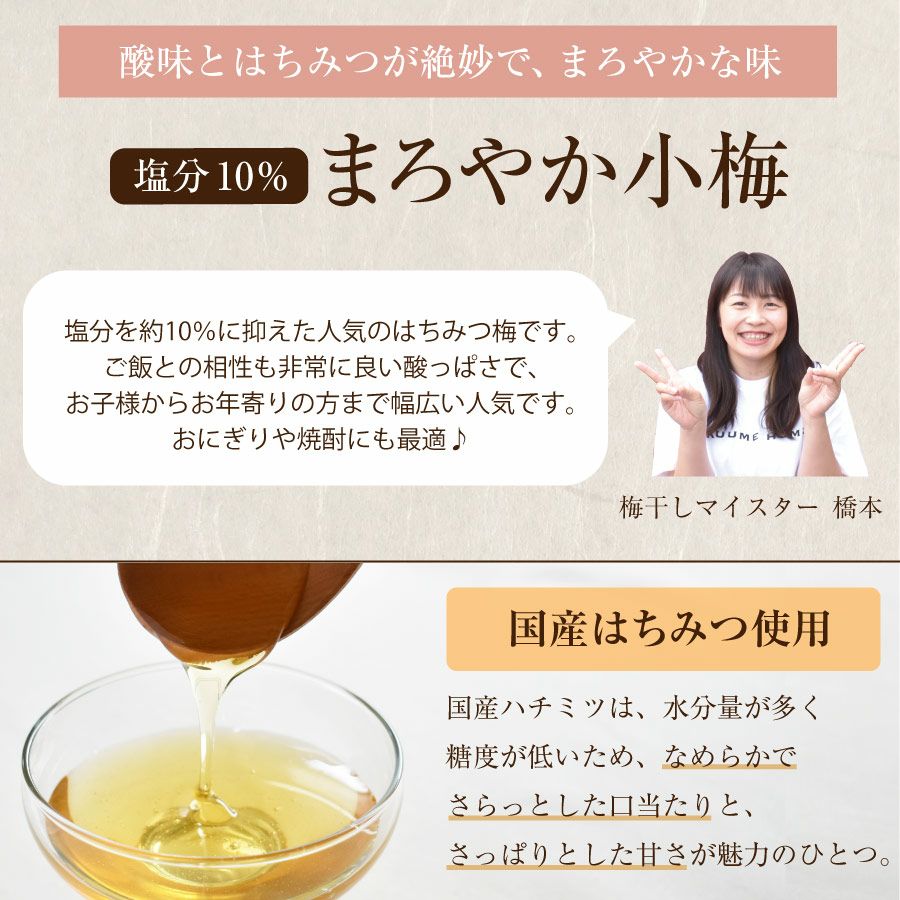 他の画像を見る 特選紀州南高梅 まろやか梅250g(塩分約10%)ご飯にもぴったりのはちみつ梅干し 人気№1 はちみつ 塩分10% 定価 ¥ 1,700 のところ 当店特別価格 ¥ 1,530 税込 会員価格あり 商品詳細を見る お気に入りに登録する