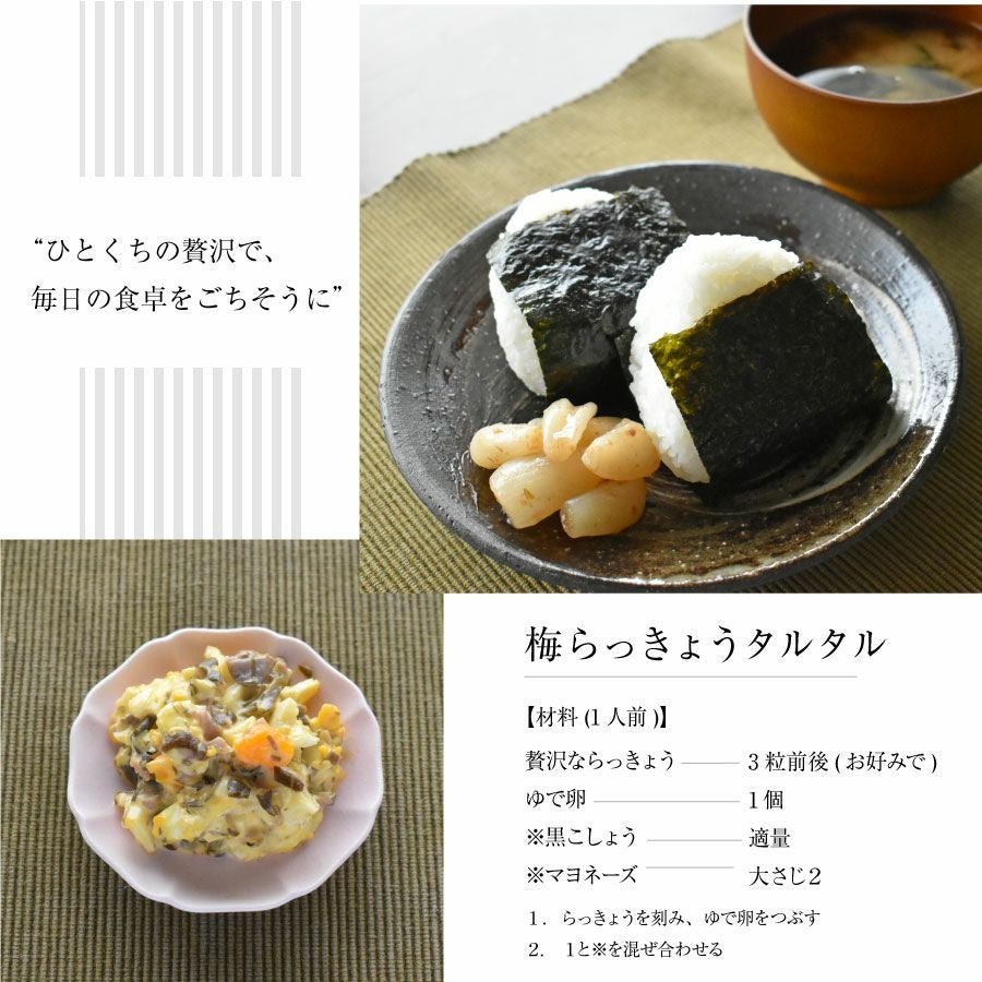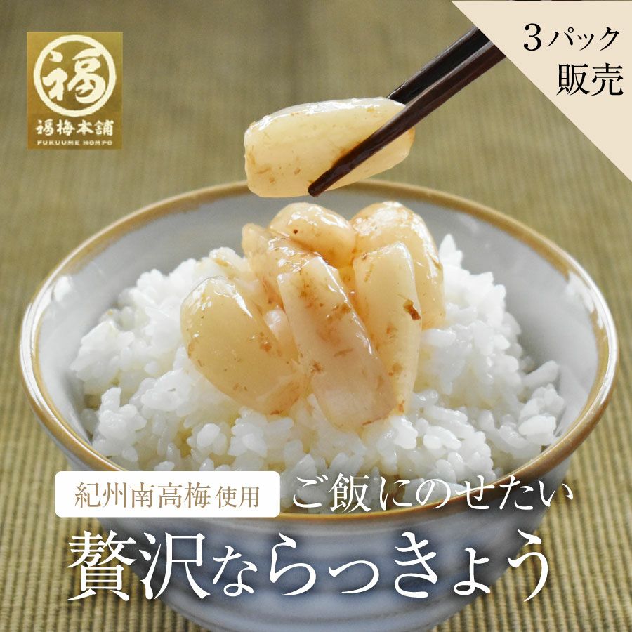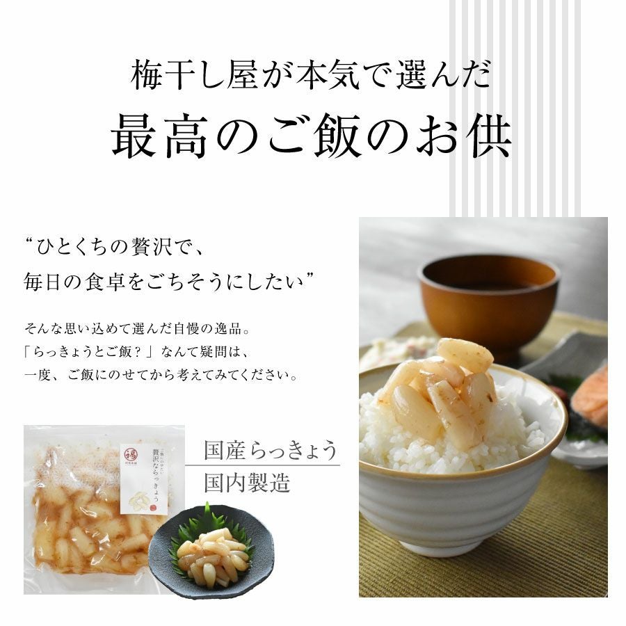 他の画像を見る 梅干し屋が本気で選んだ、最高のご飯のお供 贅沢ならっきょう100g【3パックまとめ買い】 限定販売 当店特別価格 ¥ 2,160 税込 会員価格あり 商品詳細を見る お気に入りに登録する