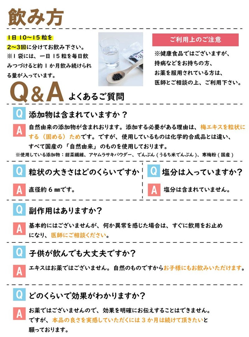 練状が苦手な方にはこちらをおすすめします。1日10~15粒を、2~3回に分けて、お飲み下さい。30gでは約10日いただけます。 この一袋で約130粒の梅エキスが入っています。一日15粒、毎日飲みつづけると約1週間分。
