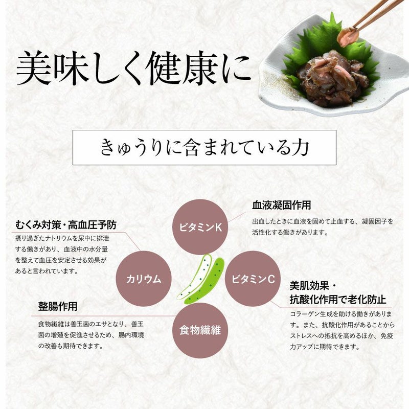 お漬物用に輸入したきゅうりが多く使われているなか、 安心・安全の国産きゅうりを使用し国内製造しています。 新鮮なきゅうりに旨味をぎゅっと漬込んだ カリカリ・ポリポリの歯ごたえがやみつきに!