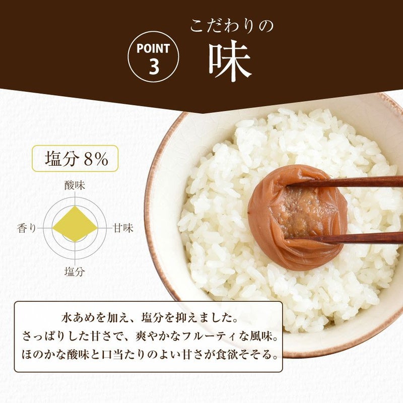 水あめを加え、塩分を抑えました。 さっぱりした甘さで、爽やかなフルーティな風味。 ほのかな酸味と口当たりのよい甘さが食欲そそる。
