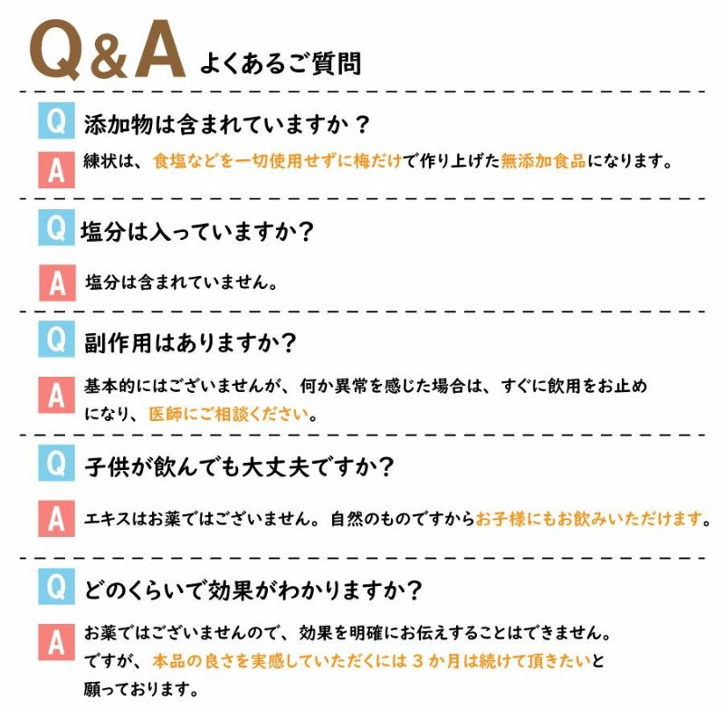 練状タイプは梅エキスの原液タイプということです。初めてエキスを飲むという方には、45gから始めてみてみてください。また、練状を外出先でも飲み続けたいという方には、こちらが携帯に便利です。 練状で、苦さとすっぱさがありますが、そのまま飲んでも良ですし、水やぬるま湯に溶かしてジュースなどにもどうぞ。
