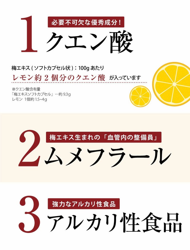 梅エキス(ソフトカプセル状):100gあたり レモン約2個分のクエン酸 が入っています