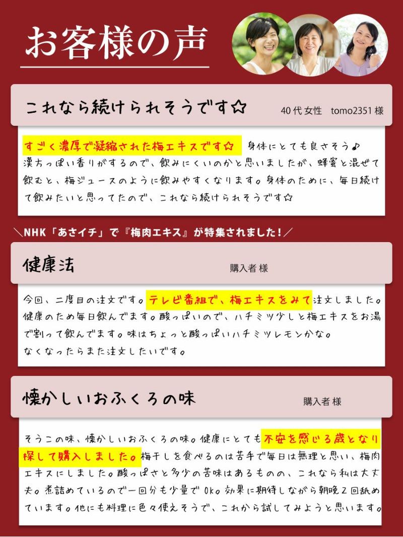 そうこの味、懐かしいおふくろの味。健康にとても不安を感じる歳となり 探して購入しました。梅干しを食べるのは苦手で毎日は無理と思い、梅肉 エキスにしました。酸っぱさと多少の苦味はあるものの、これなら私は大丈 夫。煮詰めているので一回分も少量でOK。効果に期待しながら朝晩2回舐め ています。他にも料理に色々使えそうで、これから試してみようと思います。