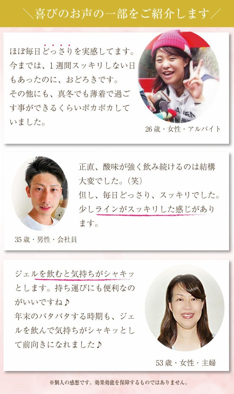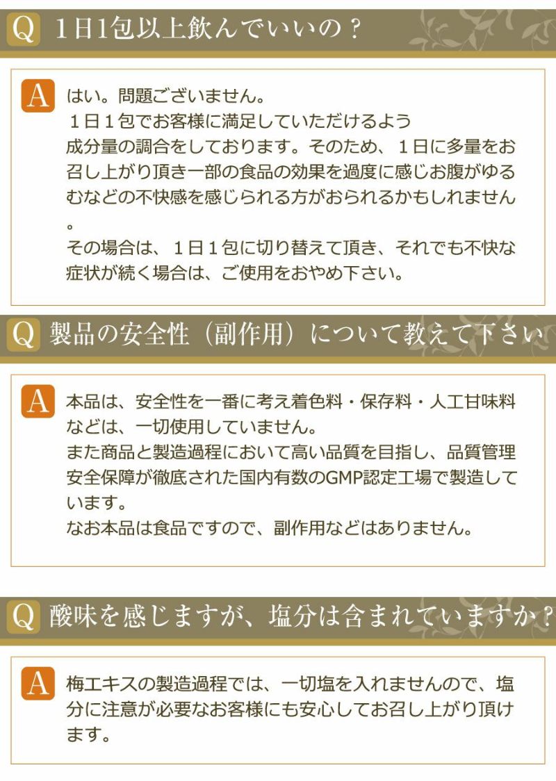 梅エキス、果糖、果汁(梅、りんご、プルーン、オレンジ、ブドウ)、植物発酵物、加工黒糖、デキストリン、ヨモギ抽出物、こんにゃく粉、黒コショウ抽出物/クエンシクロデキストリン、甘味料(ステビア)、クエン酸、葉酸(原材料の1部にバナナ、大豆、もやし、黒豆、ゴマ、カシューナッツ含む)