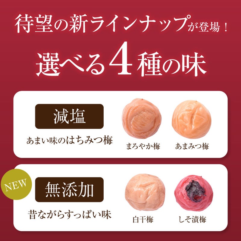 ■梅の種類:紀州特選南高梅 まろやか梅・あまみつ梅・しそ漬梅・白干梅