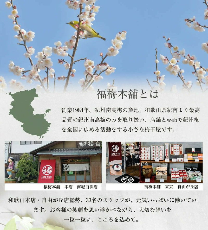 創業1984年。紀州南高梅の産地、和歌山県紀南より最高 品質の紀州南高梅のみを取り扱い、店舗とwebで紀州梅 を全国に広める活動をする小さな梅干屋です。