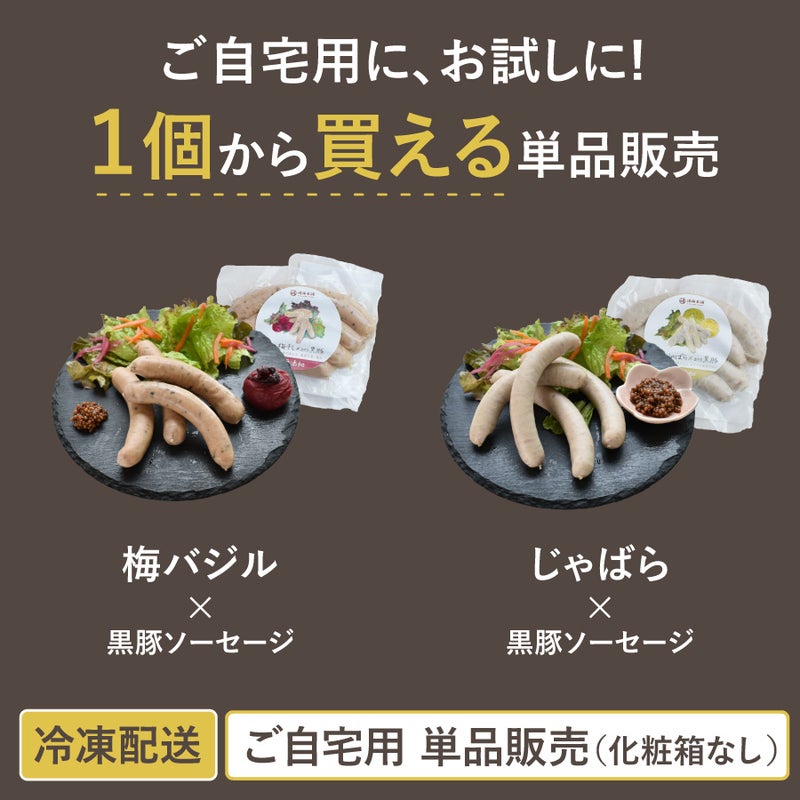 ■原材料 和歌山梅干し×鹿児島黒豚ソーセージ:豚肉(黒豚(鹿児島県産)、糖類(水飴、砂糖(洗双糖糖))、食塩、調味梅干し、食塩、香辛料、魚醤(さけを含む)、昆布粉末、レモン果汁 栄養成分表(100gあたり) エネルギー:217kcal /たんぱく質:14.1g /脂質:16.7g/ 炭水化物:2.5g/ 塩分相当量:1.3g 和歌山じゃばら×鹿児島黒豚ソーセージ:豚肉(黒豚(鹿児島県産)、糖類(水飴、砂糖(洗双糖糖))、じゃばら果皮粉末、香辛料、魚醤(さけを含む)、昆布粉末 栄養成分表(100gあたり) エネルギー:284kcal /たんぱく質:13.8g /脂質:24.3g/ 炭水化物:2.5g/ 塩分相当量:1.3g