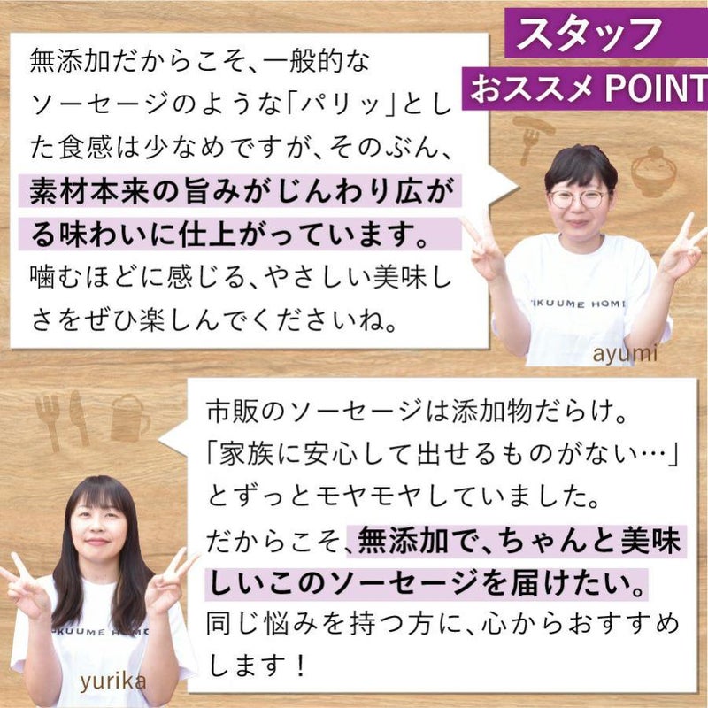 無添加だからこそ、一般的なソーセージのような「パリッ」とした 食感は少なめですが、そのぶん、素材本来の旨みが じんわり広がる味わいに仕上がっています。 噛むほどに感じる、やさしい美味しさをぜひ楽しんでくださいね。