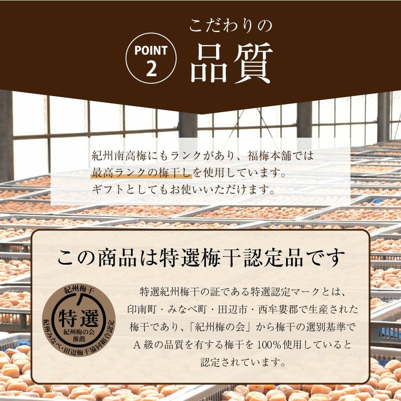 紀州南高梅にもランクがあり、福梅本舗では 最高ランクの梅干しを使用しています。 ギフトとしてもお使いいただけます。