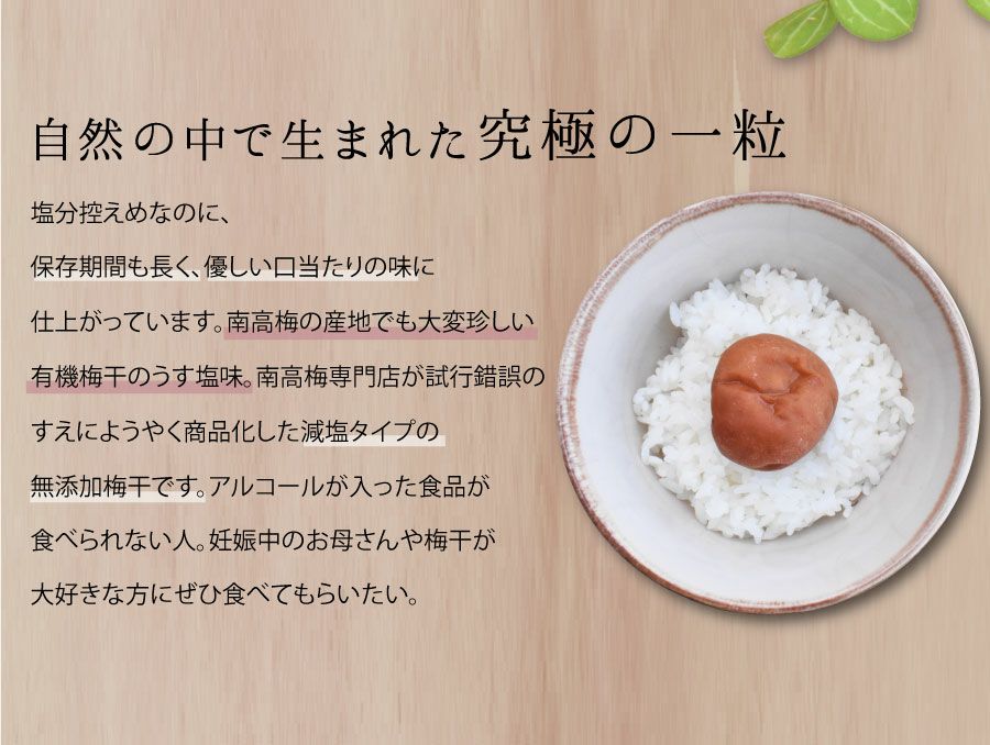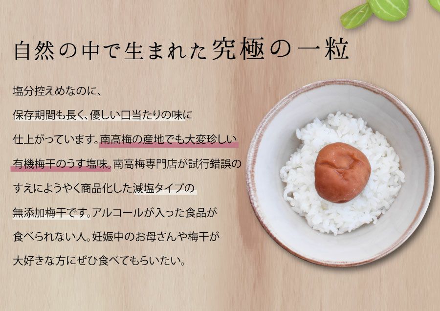 他の画像を見る \無添加・無農薬/ 梅干し 無添加 有機梅干し 紀州南高梅ORGANIC USUSHIO 150g 当店特別価格 ¥ 1,800 税込 会員価格あり 在庫切れ 商品詳細を見る お気に入りに登録する