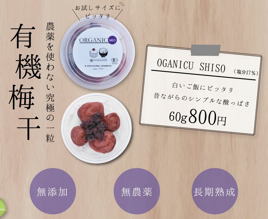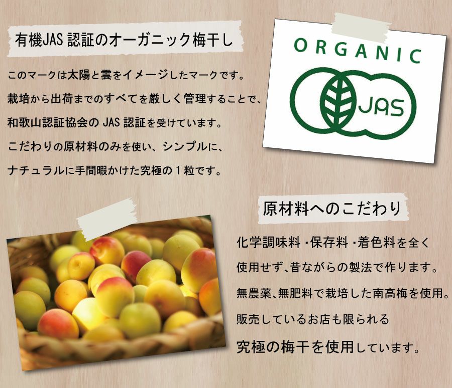 ナチュラル志向のあなたのための、 「有機JAS認証」オーガニック梅干しです。 長期熟成。さらに、こだわりの原材料のみを使った、 今までにない新しい梅干しです。