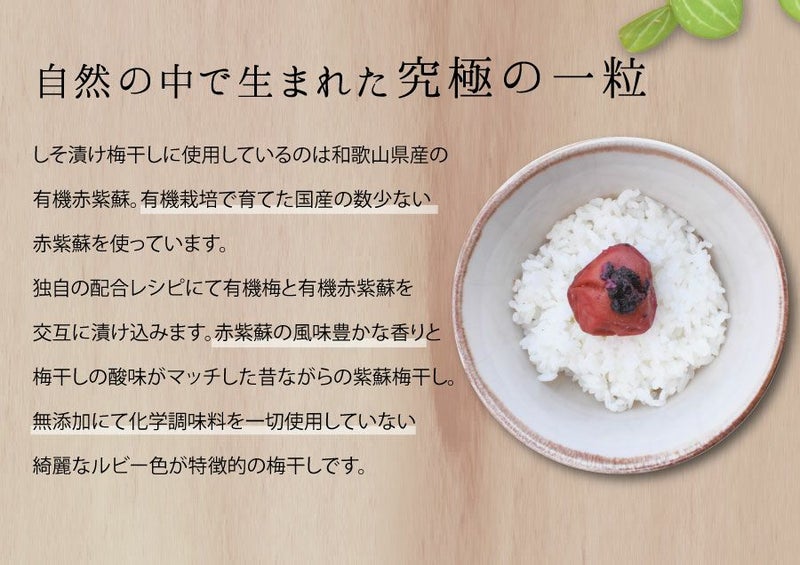 しそ漬け梅干しに使用しているのは和歌山県産の 有機赤紫蘇。有機栽培で育てた国産の数少ない 赤紫蘇を使っています。 独自の配合レシピにて有機梅と有機赤紫蘇を 交互に漬け込みます。赤紫蘇の風味豊かな香りと 梅干しの酸味がマッチした昔ながらの紫蘇梅干し。 無添加にて化学調味料を一切使用していない 綺麗なルビー色が特徴的の梅干しです。