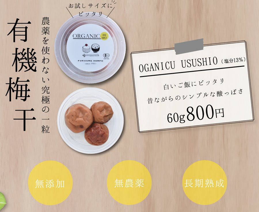他の画像を見る \無添加・無農薬/ 梅干し 無添加 有機梅干し 紀州南高梅 オーガニックORGANIC USUSHIO 60g 当店特別価格 ¥ 800 税込 会員価格あり 在庫切れ 商品詳細を見る お気に入りに登録する