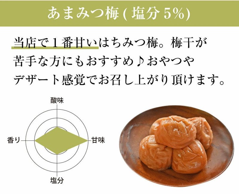 あまみつ梅:梅、漬け原材料〔砂糖、還元水飴、食塩、りんご酢、蜂蜜〕、酸味料、酒精、ビタミンB1、甘味料(スクラ ロース) (原材料の一部にりんごを含む。)