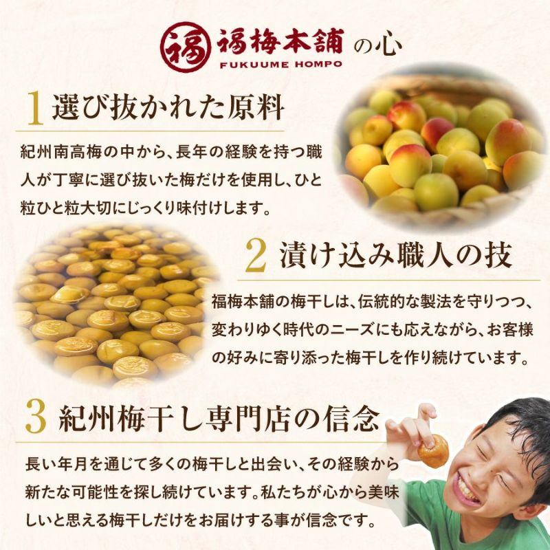福梅本舗は、南紀白浜にお店を構える、小さな梅干屋ですが、創業以来「梅」に対する姿勢を崩さず、愛する梅を通じて、「満足」と「幸せ」をお客様にお届けし続けております。