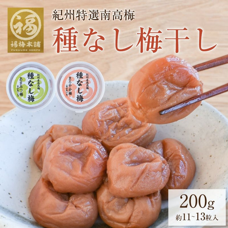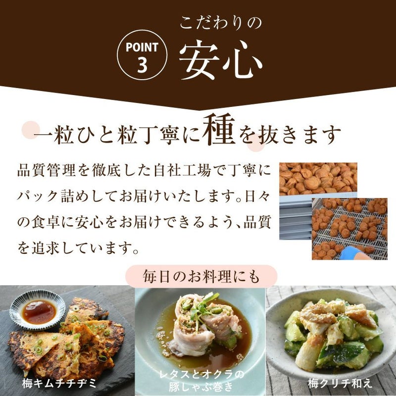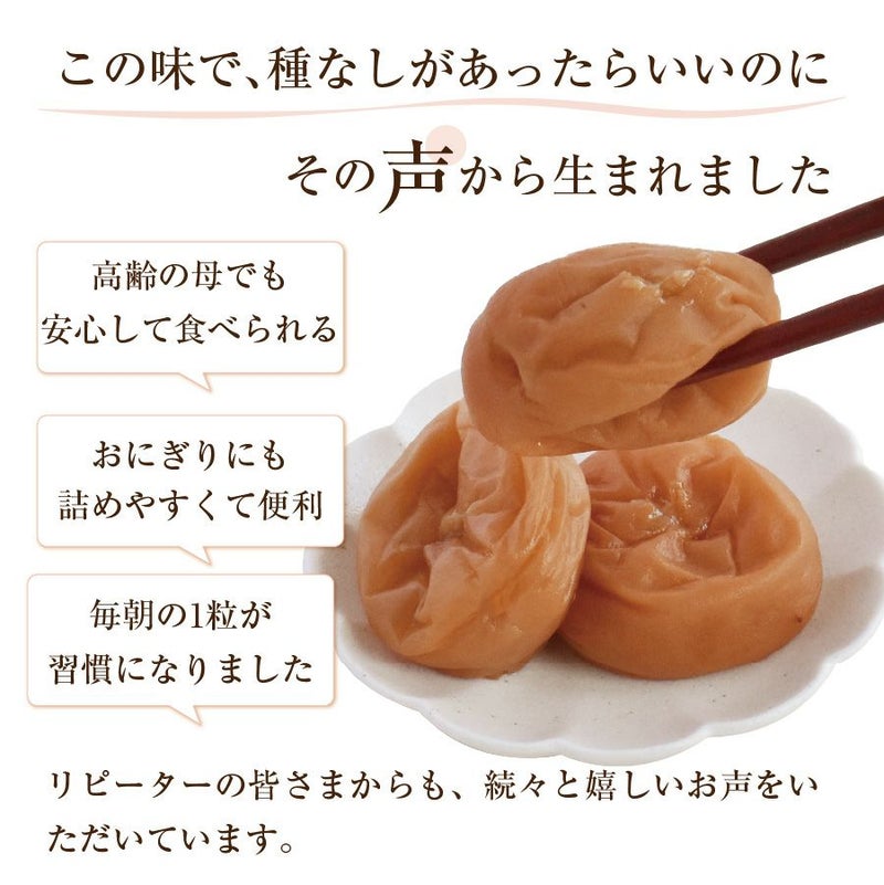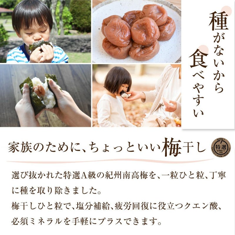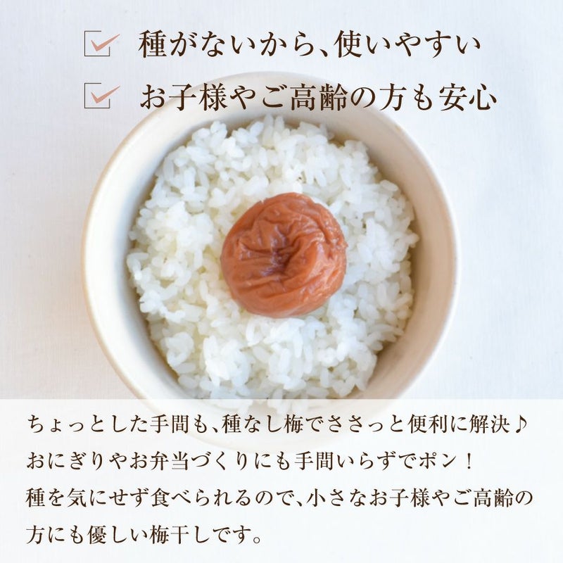 和歌山県産の特選A級「紀州南高梅」を一粒ひと粒、丁寧に種を取り除きました。種がないから、お子様からご高齢の方まで安心してお召し上がりいただけます。