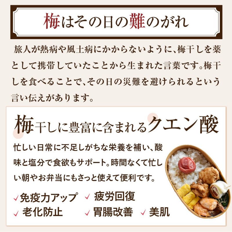 梅干し1粒で、塩分補給、クエン酸による疲労回復、必須ミネラルの補給も手軽に。毎日の健康習慣にぴったりの梅干しです。