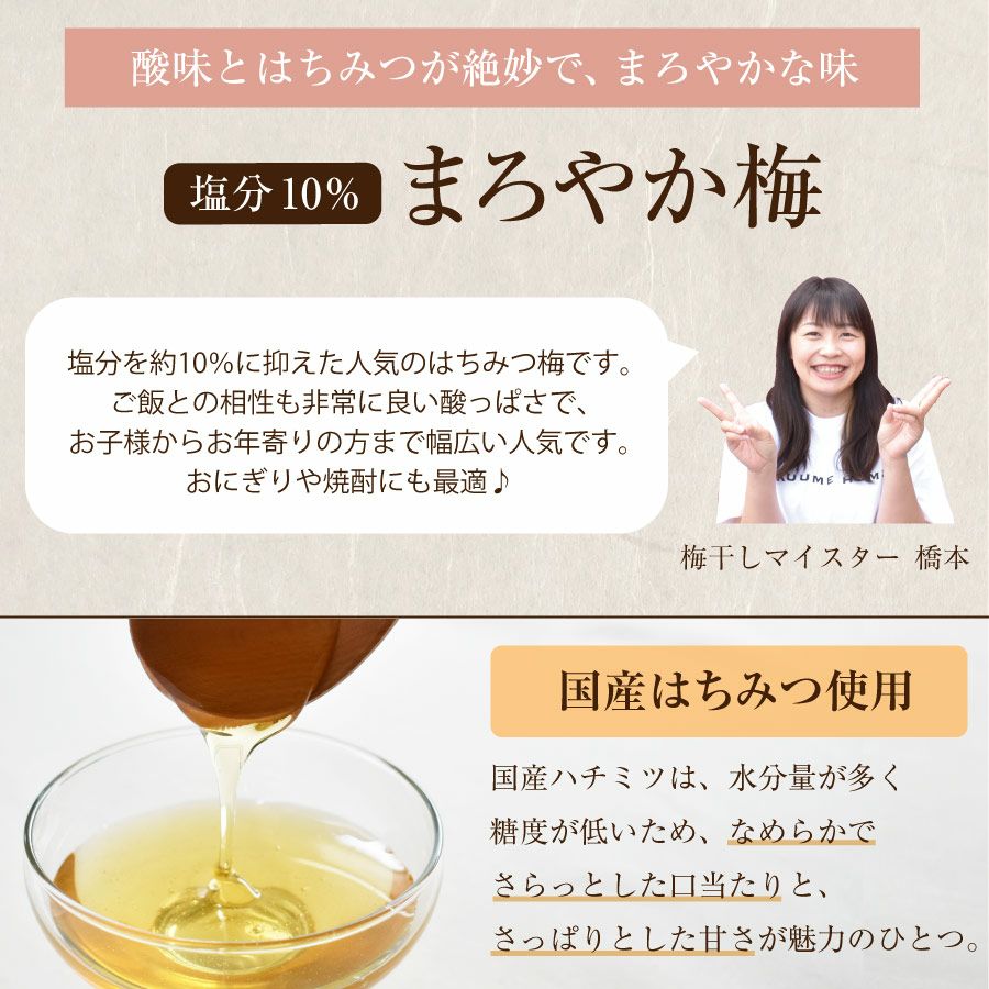 塩分を約10%に抑えた人気のはちみつ梅です。 ご飯との相性も非常に良い酸っぱさで、 お子様からお年寄りの方まで幅広い人気です。 おにぎりや焼酎にも最適♪