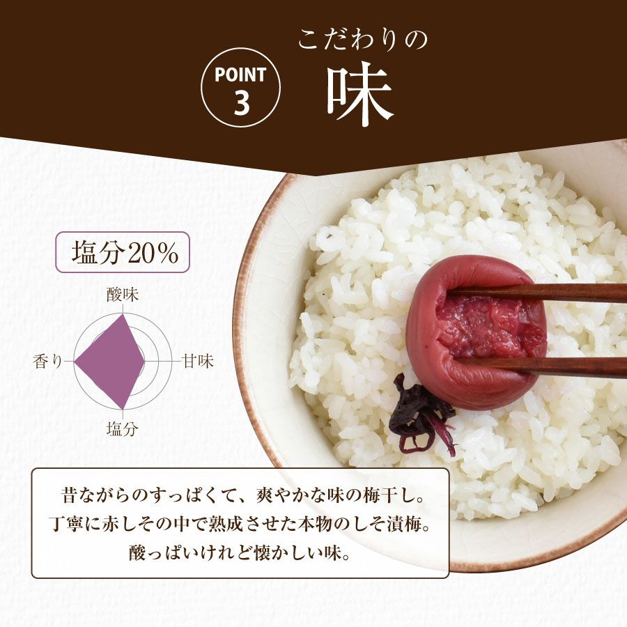 これぞ「梅干し」と言われる紫蘇と塩だけの梅干し。 昔ながら独自の製法で、手間ひまを掛けて じっくりと仕上げてました。すっぱい梅干しが 好きな方には、本当におススメの梅です♪