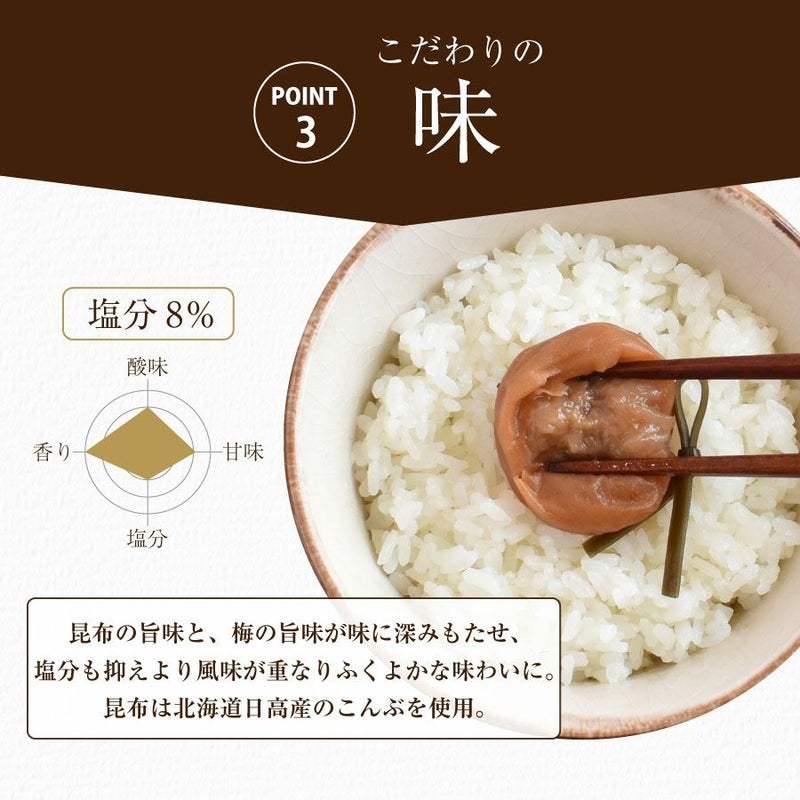 こちらのこんぶ梅を食べてから他の梅干しを買うことがなくなり、こちらのお店でずっとリピートしています。塩分控えめで、そのまま食べても美味しいですし、お料理にもよく使います。