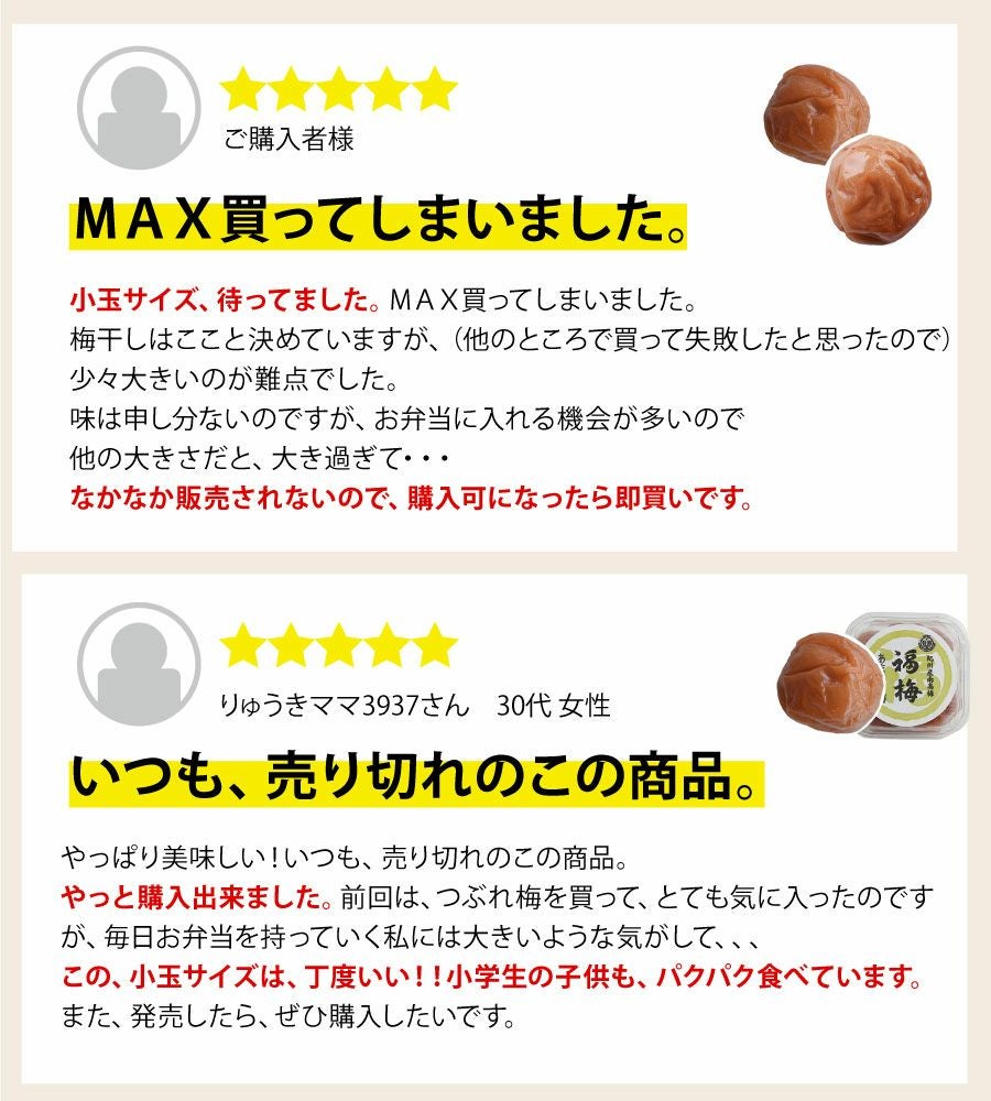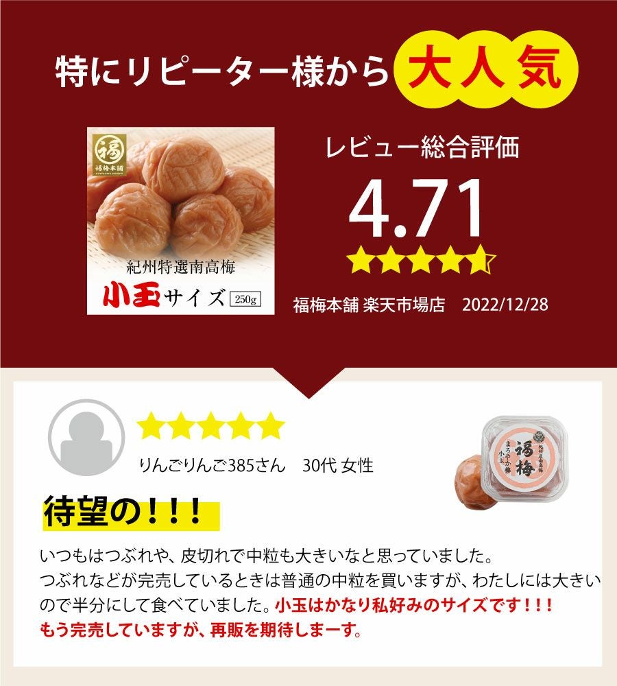 他の画像を見る \今だけ30%OFF/ 1,700→1,190円!おひとり様5個まで年に数回だけの販売! 【特選紀州南高梅】小玉サイズ梅干し250g 定価 ¥ 1,700 のところ 当店特別価格 ¥ 1,190 税込 会員価格あり 在庫切れ 商品詳細を見る お気に入りに登録する