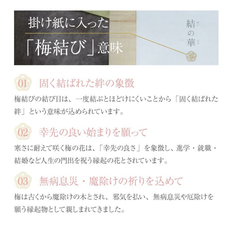梅結びの結び目は、一度結ぶとほどけにくいことから「固く結ばれた 絆」という意味が込められています。