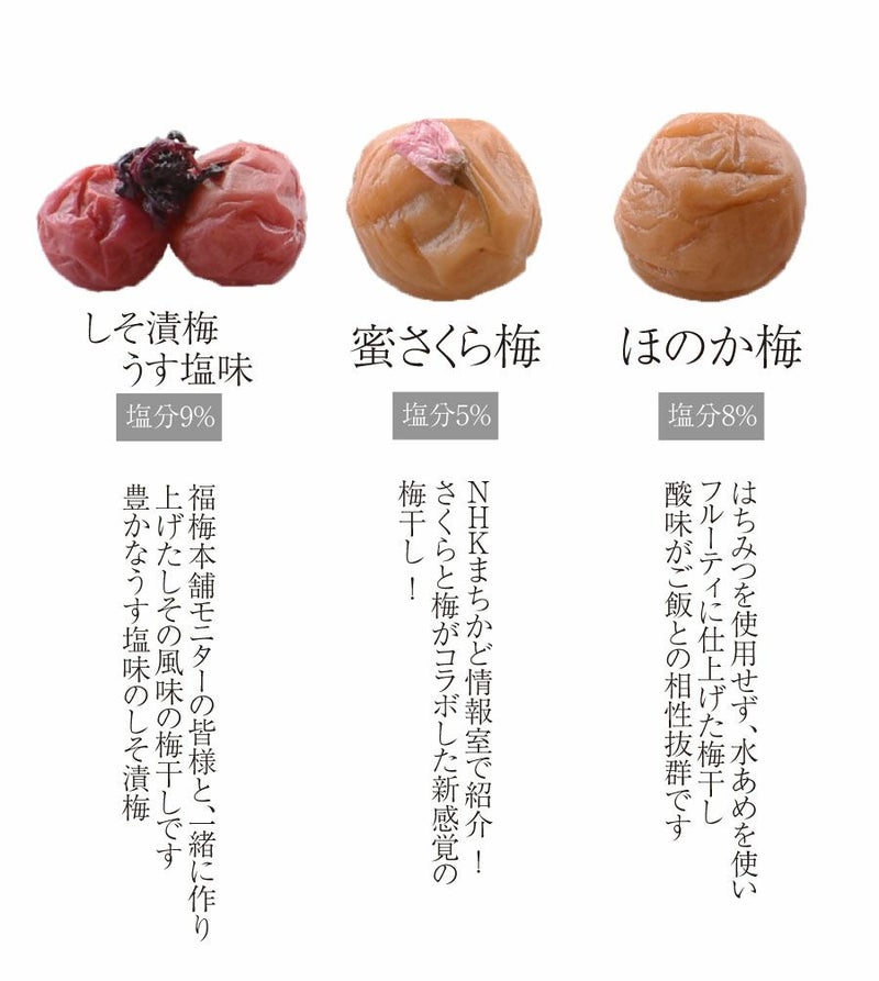 かつお梅:梅、しそ、かつお削り節、漬け原材料〔食塩、還元水飴、発酵調味料、糖類(砂糖・果糖ぶどう糖液糖)、たん白加水分解物、はちみつ〕、調味料(アミノ酸等)、酸味料、ビタミンB1、甘味料(ステビア)、野菜色素、(原材料の一部に大豆を含む)