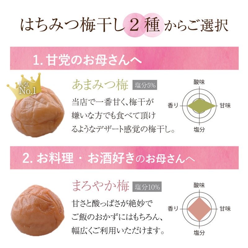 ■梅の種類:紀州特選南高梅 まろやか梅・あまみつ梅・しそ漬梅・白干梅