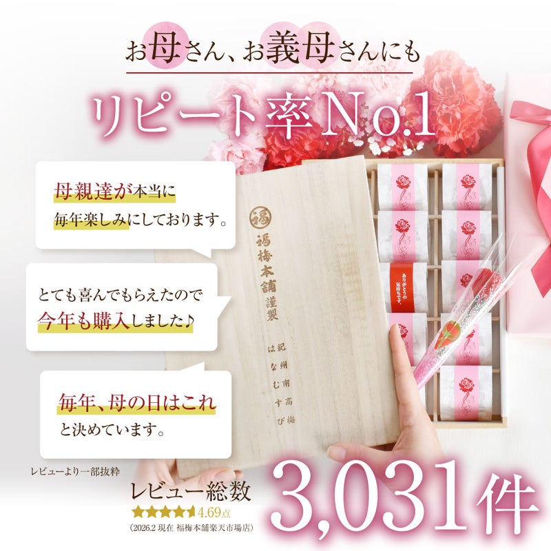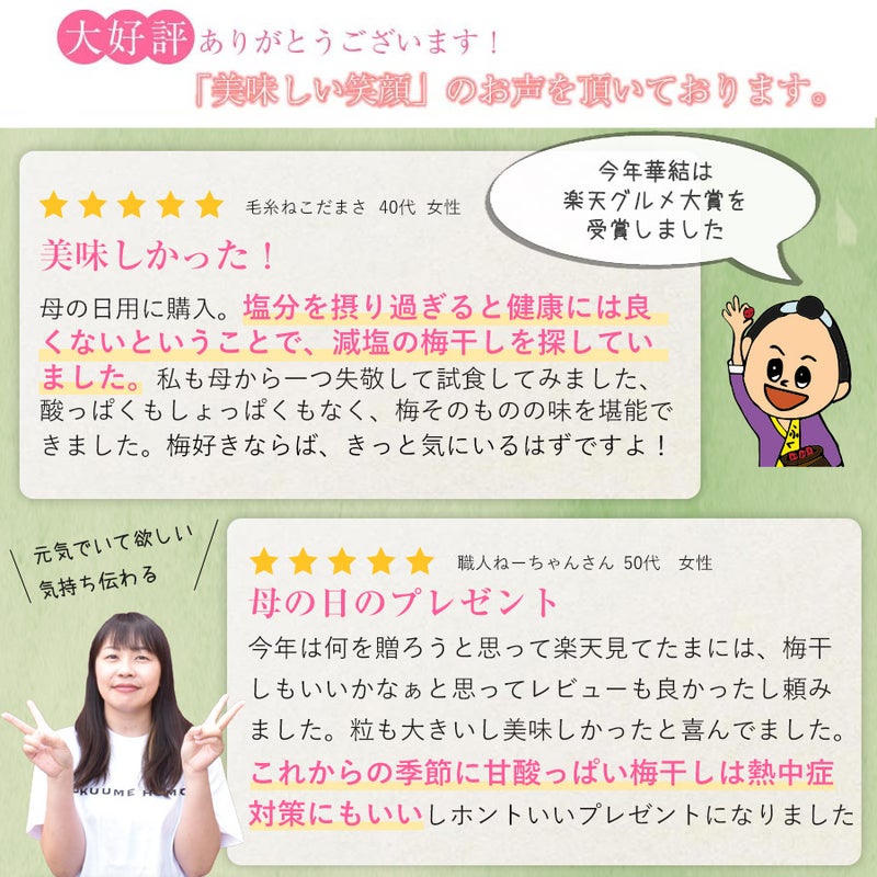 花にするかスイーツにするかで迷っていたところ、この梅干しを 見つけました。とっても美味しいと絶賛でした!もったいないので、 1日一粒づつ食べるとのこと。この自宅自粛の毎日、小さな楽しみがあ るのも大事なの、贈って良かったと思いました。桐箱、お洒落な包装 など、メインの梅干し以外でもポイント高かったようで、母 は大喜びでした。また、利用したいです。ありがとうございました。 今度は、自分のご褒美用に買ってみようかな…と考えております(^^)