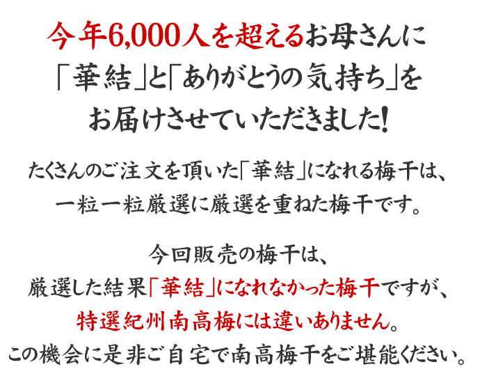 梅干の選別基準で最高品質のA級(特選マーク認定)の梅干をさらに選別のプロが再選別してお届けしています。ご贈答用梅干はその中でも選り抜きの梅干のみをお届けしています。 |