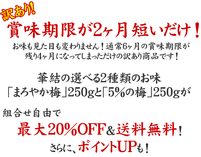 19%OFF!【送料無料】【ポイント2倍】NHK紹介記念!当店一番人気のまろやか梅または5%の梅が選べる500g!!(250g×2パック)が送料無料1,500円!