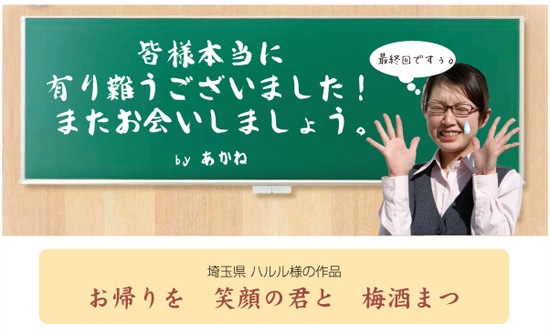 古谷さんレポートお疲れさまでしたー。これからは皆様からご応募いただいた和歌をご紹介させて頂きます。そして、今回が私の「みんなで国語」はおしまいです。本当に有り難うございましたー。(;_;)では、皆様の作品の発表をさせて頂きますねー。