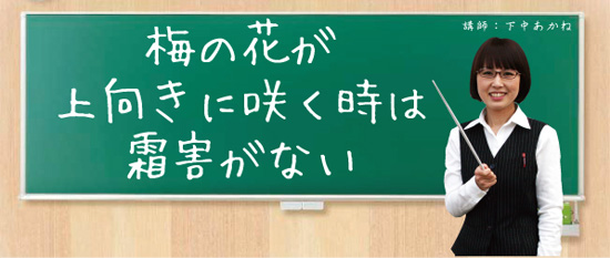 これは梅の特性を諺にしたものなんです。寒い信州の方でこう言われますが、南国鹿児島では「梅の花が下向きで咲くと雨年、上向きは照り年」といわれます。