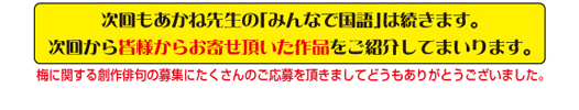 今回はご挨拶でも申し上げましたように、「元気が出る和歌」というお題を私からスタッフ(&あるじ)に出して、個性豊かな元気な和歌を作ってもらいました。もともと梅と健康は切っても切れない関係だけに、すごく健康になれそうな自然で楽しい作品に仕上がっていますね~。
