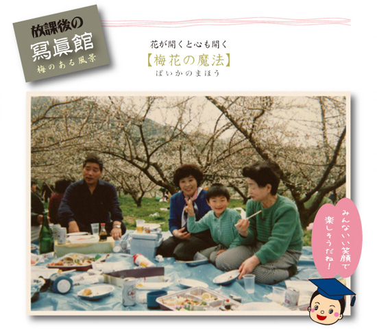 この写真は私がまだ小さかった頃に親戚みんなで南部梅林にお花見に行ったときの写真ですが、みんなが花を見ているのは最初だけで、宴会が始まってしばらくしたら父も母も親戚の人たちも、踊ったり隠し芸をやったりと大盛り上がりで、とても楽しそうでした。