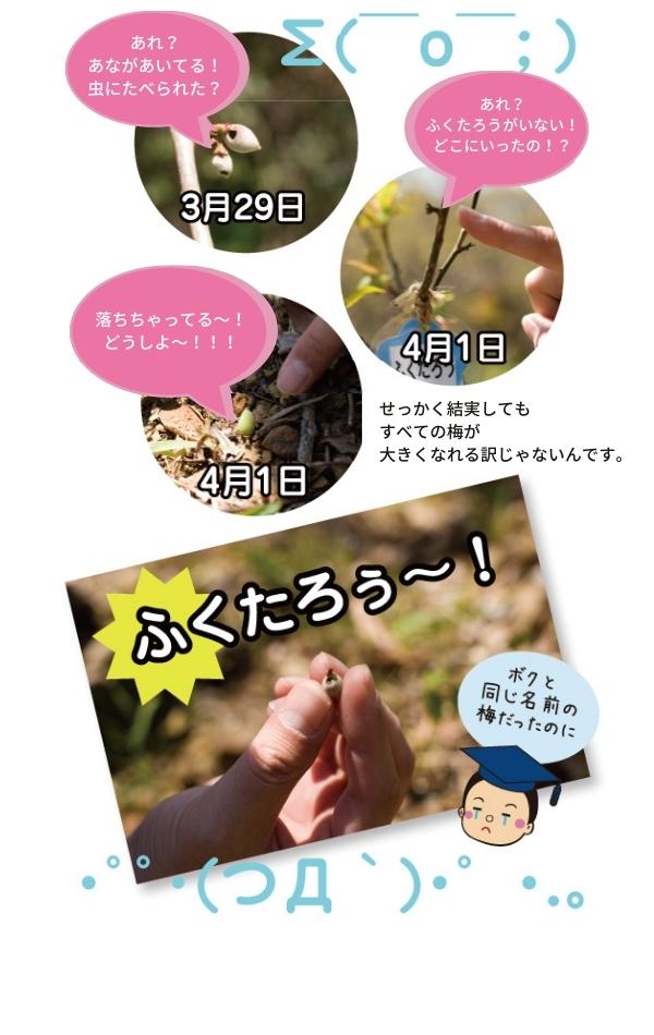 順調に育っていたはずのふくたろうの実に異変が起きたのは3月29日のこと、そして4月1日の観察で虫に食べられていたふくたろうの実は悲しいことに落ちていました(T_T)さみしい・・・と言う訳で、ふくたろう、ふくこ、ふくじろうに代わり、うめたろう、うめこ、うめじろうで結実情報をお送りしていきます。