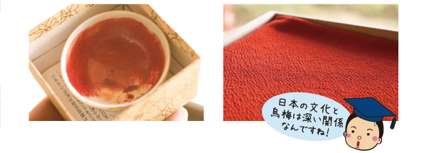 また、烏梅は紅花染めの色止めとして使われます。左の写真は口紅やほお紅にも使われます。中西さん宅で拝見した紅花染めは化学染料では出せない和の風情タップリの色合いで、本当にキレイでした。中西さん、この度はどうもありがとうございました。そしていつか観梅シーズンに訪れてみたい風光明媚な月ヶ瀬村でした。