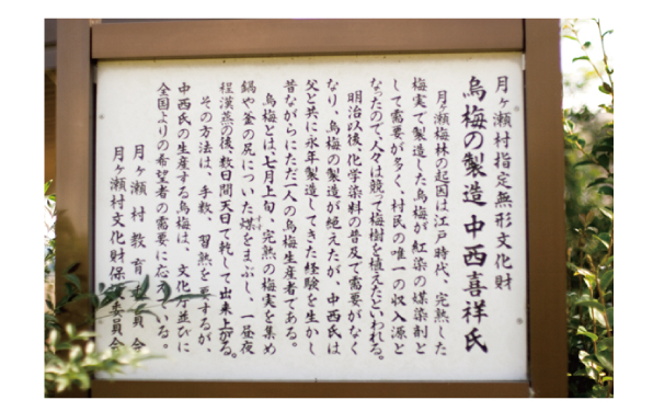 私たち福梅スタッフは梅仙人とともに月ヶ瀬村で唯一の烏梅を製造されている中西さんをお伺いし、烏梅の製造方法について伺って来ました。中西さんのお宅の側にはこのような立て札が立っていました。無形文化財・・・!すごい!早速、烏梅の製造方法について伺う事にしました。