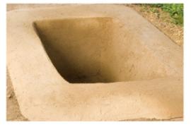 | 地面に掘られたかまどに火を起こして、 モミガラを入れます。 |