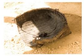 この箕に梅を入れ、水に濡らしてススを まぶして転がし、まんべんなくススを付け ます。 |
